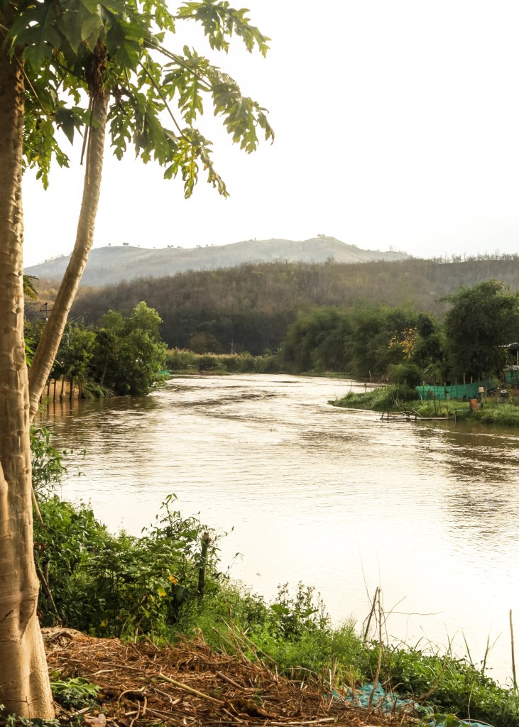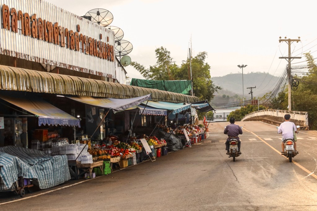 I make a pit stop for the night in Mae Chaem, about an hour outside of the national park. Waterlogged, I arrive at Kwanlah Homestay in the late afternoon. A hot shower works wonders and the owner offers his drier for my clothes peel off my wet. I’ve never never felt so chilly in Thailand. Mae Chaem is a charming little village. It sits in the valley astride a little river, completely off the tourist circuit. After a hot shower, I grab some skewered meat and poke around the village.