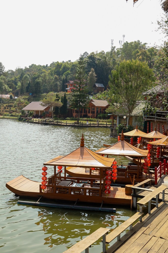 Ban Rak Thai is known for its tea, which grows all over the surrounding countryside. In the center of town is a reservoir, edged by tea shops and little wooden piers. Paddle boats stand at the ready and red paper lanterns blow in the breeze. The town seems geared towards tourism, but it’s a pretty quiet afternoon and it makes a great lunch stop.