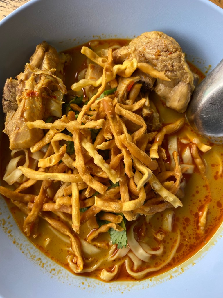 Khai Soi Khun Yai has some of the best Khao Soi in all Thailand. It’s one of my favorite dishes: a broth of red curry and coconut milk, soft noodles and a chicken leg, topped off with a mound of crispy golden fried noodles and cilantro.