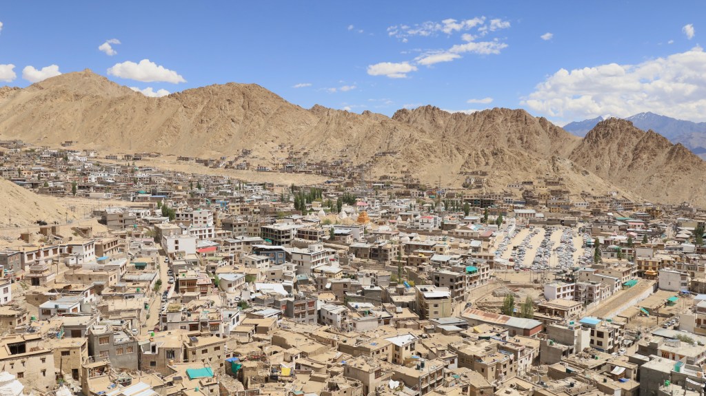 For centuries Leh has been a stop on the trade routes that link India with China and Tibet. It lies in a parched valley along the Indus River, marked by stands of poplar and willow trees that are conspicuously absent from the natural landscape.